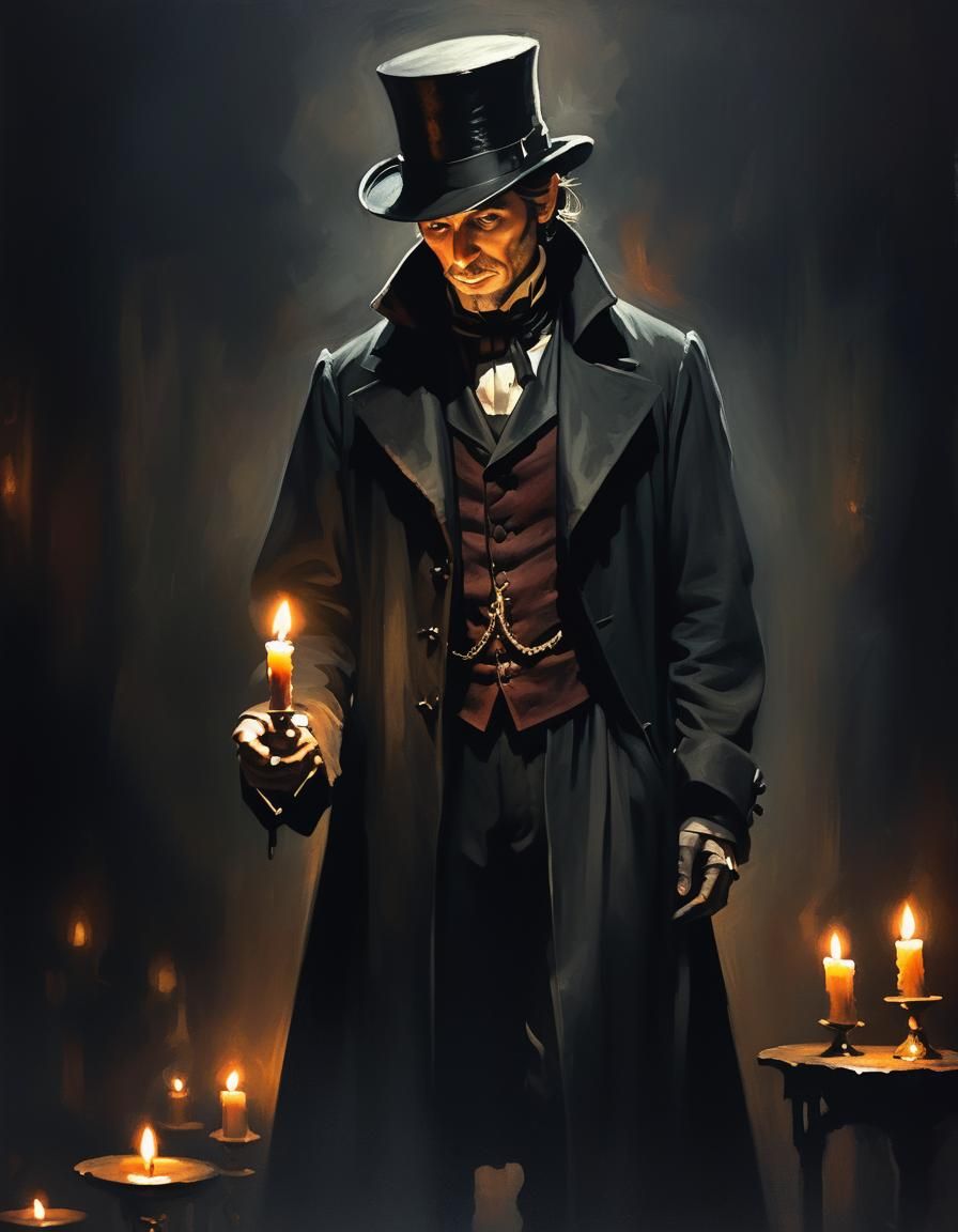 A striking picture of a magician on a dark stage holding a candle. The scene is rendered in a moody oil painting style, with a warm color scheme, heavy chiaroscuro, and dramatic lighting.
