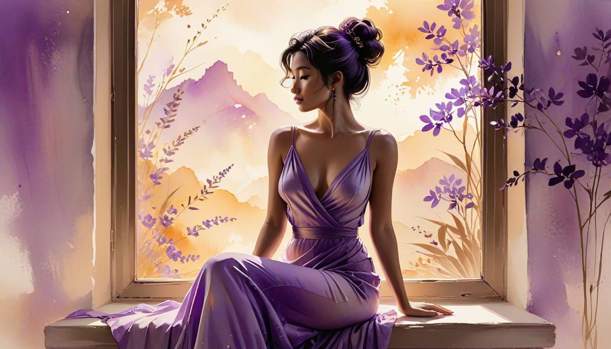 A minimalist one-line drawing of a seated, topless woman. The image is rendered in a sumi-e ink and watercolor style, with soft amethyst and sand hues and an ethereal bokeh background.