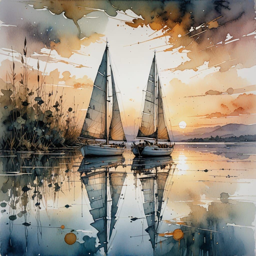 This image captures a peaceful sailboat scene on a glassy lake at sunrise, rendered in a stylised watercolour aesthetic