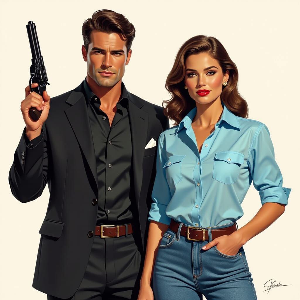 This image shows an attractive dark-haired man and woman holding revolvers. They are sharply dressed and exude confidence in a noir-inspired aesthetic.