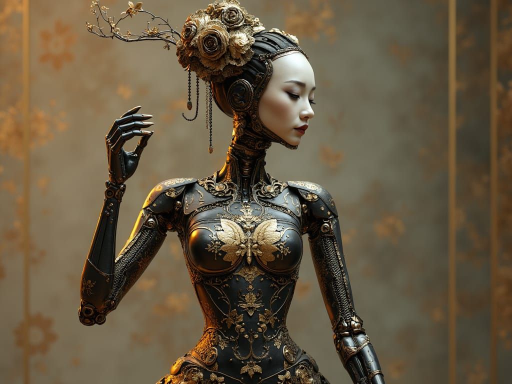 This image depicts a captivating cyborg geisha with a slender, intricately etched metal body, adorned with black and gold florals, performing a traditional dance with elegance and poise, blending Victorian-era luxury with sci-fi futurism.