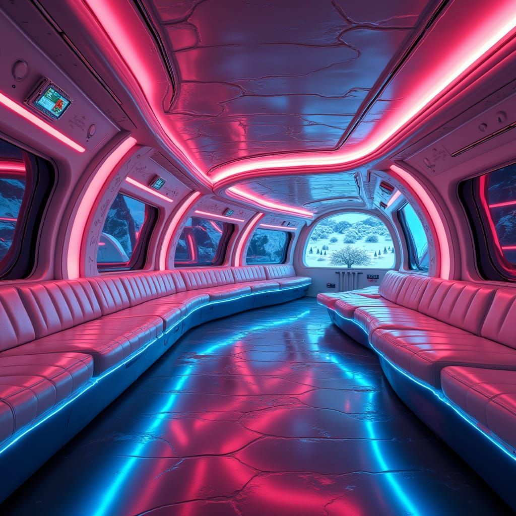 This image shows a high-tech interior design featuring Frutiger font influences, neon lighting, and reflective surfaces. The aesthetic combines futuristic concept art with a vibrant, colourful style.