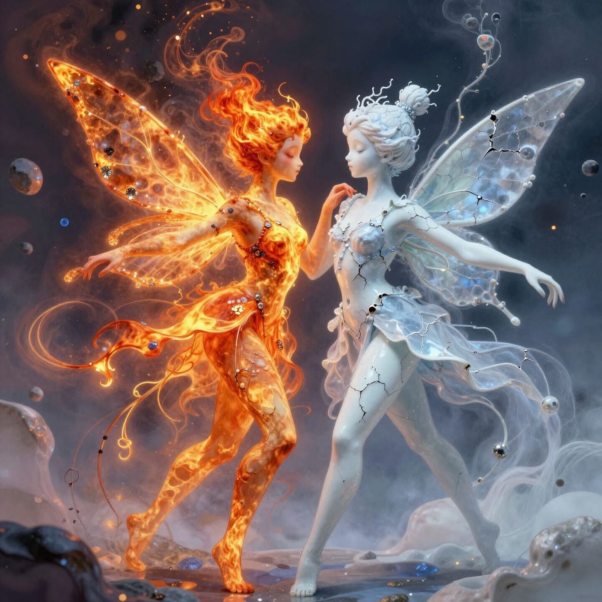 This surreal image shows a fire fairy and snow fairy engaged in a vivid dance. The scene features a fractured porcelain surface with organic growths and mineral elements, rendered in luminous airbrushed colors.