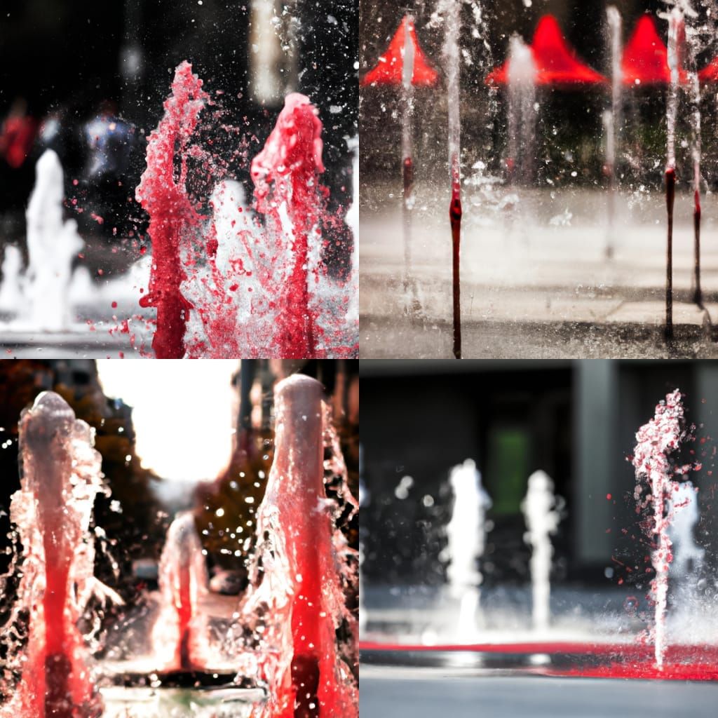 This image shows blood pouring from fountains in a surreal street scene. The image, captured with a DSLR camera, features a shallow depth of field and natural lighting.