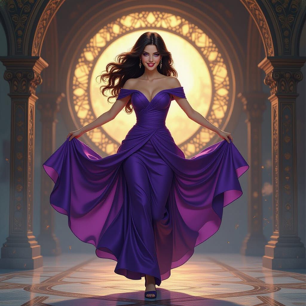This image shows a beautiful, smiling woman with violet eyes and brown hair leaping through time. The alcohol ink splatter style and dynamic lighting create a dark fantasy aesthetic.