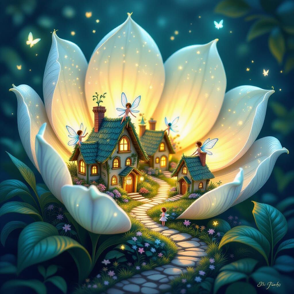 This image depicts a charming fairy village within a massive, glowing flower. Tiny homes and winged folk are illuminated by ethereal light, creating a magical, fantasy art scene.