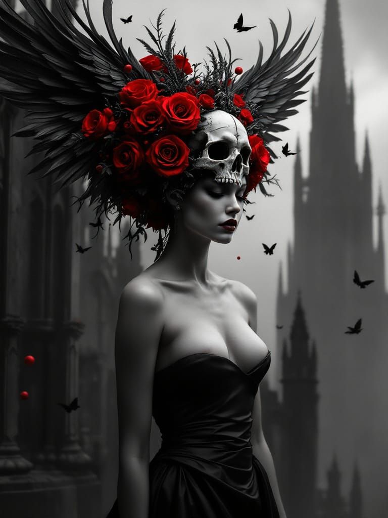 A stark, high-contrast portrait of a regal woman with a skull and feathered headdress. Vivid crimson roses contrast with the monochrome gothic cityscape and noir mystery.