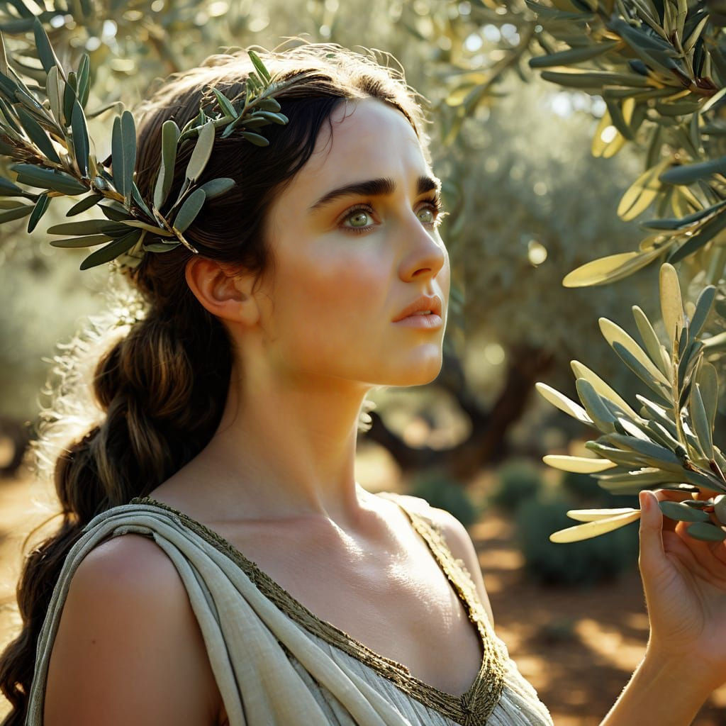"Young Jennifer Connelly. Mythical realism. Close up. Orseis Olivea, a mix of dryad and nymph, stands in a lush olive grove. Medium shot. Soft focus photography. Gentle sunlight filters through olive leaves. Warm golden light on skin. Soft, serene atmosphere. Pastel colors, earthy tones."