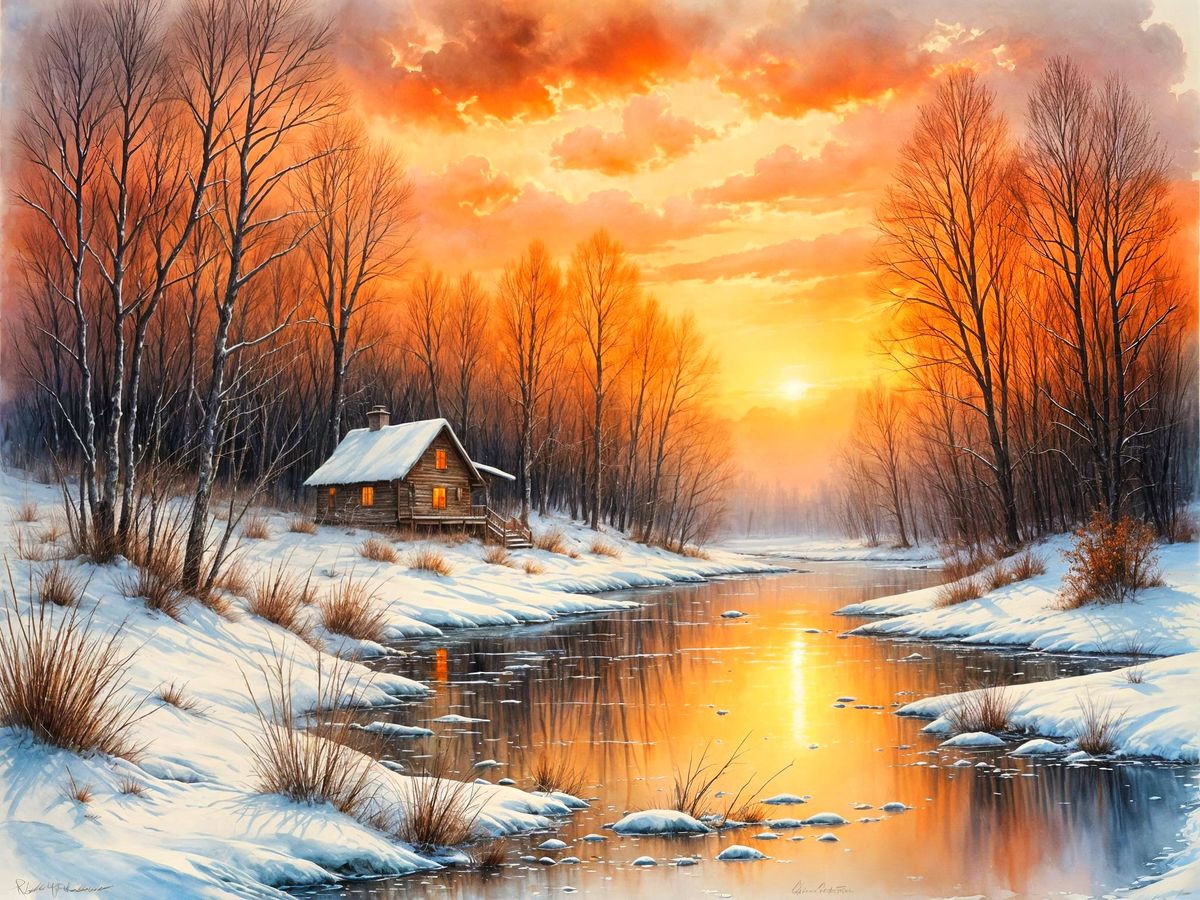 This image depicts a serene winter landscape at sunset, featuring cozy log cabins, a frozen stream, and mist-shrouded trees under a dramatic sky, rendered in a soft antique watercolor style.