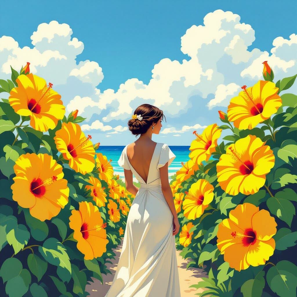 This image shows a woman in a vibrant garden filled with bright yellow hibiscus under a blue sky. The artwork evokes tropical landscapes in the style of art nouveau.