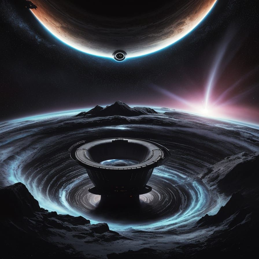 Sci-fi concept art featuring an enormous toilet integrated with a supermassive black hole, designed for expelling waste at extreme speeds. Rich cosmic colors and deep space lighting.