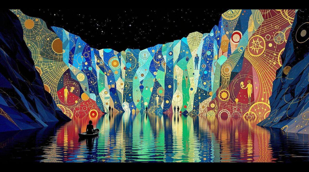 A striking picture of a marble quarry illuminated by luminescent panels. The reflective panels feature ornate, golden, cosmic patterns, set against a black, starry night sky in a Klimt-inspired style.