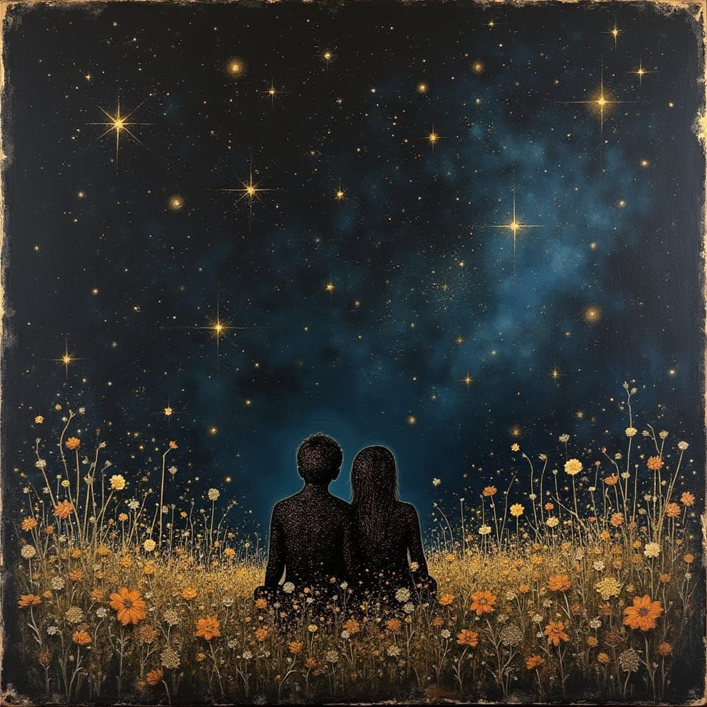 A poetic and celestial masterpiece, where the infinite vastness of the night sky embraces two silent souls. The golden-hued flowers, glowing like scattered stars, seamlessly blend earth and cosmos, evoking a sense of wonder and intimacy. A mesmerizing composition that captures the beauty of connection and the magic of the universe. Have a nice sunday @SlothFatale
