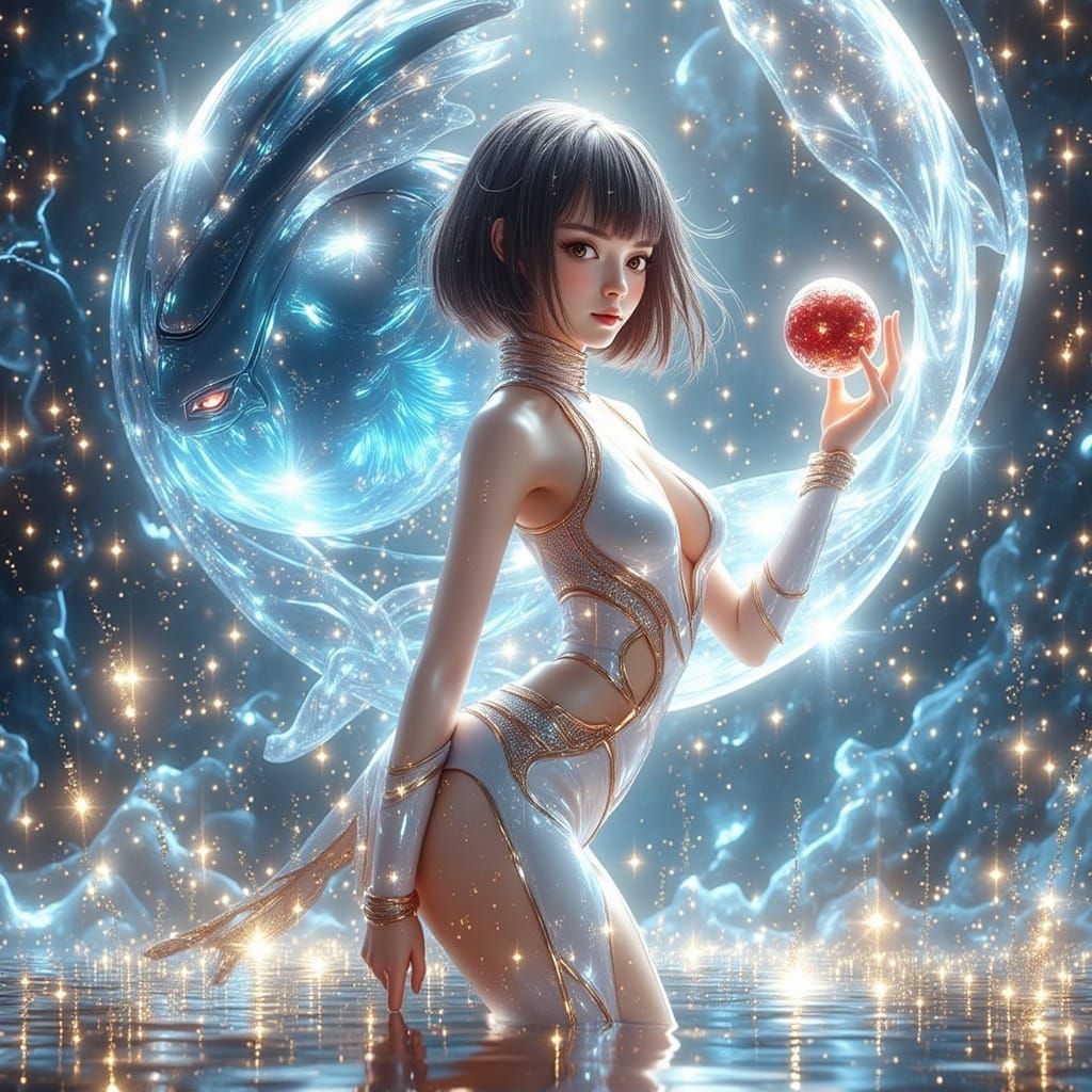 A striking image of Loxy Bliss as a dynamic Pokémon trainer, mid-throw with a Pokéball. Features include a Cleopatra bob, Nordic-Egyptian traits, and an ethereal Gardevoir companion.