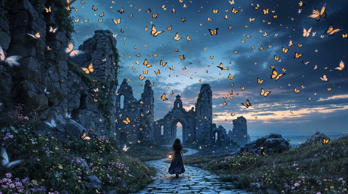 This image captures a serene and melancholic scene of beauty amidst decay in a Norwegian landscape. A girl with jet black hair walks down a cobblestone path between ancient castle ruins, surrounded by vibrant butterflies and a twilight sky with complementary colors.