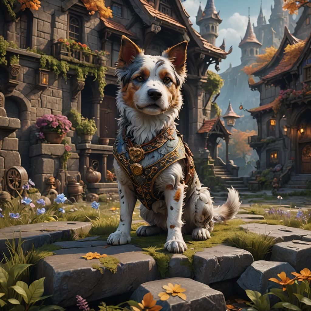 A detailed matte painting of a cute dog. This fantastical image features intricate details, deep colors, and complementary color schemes, rendered as fantasy concept art in 8k resolution.
