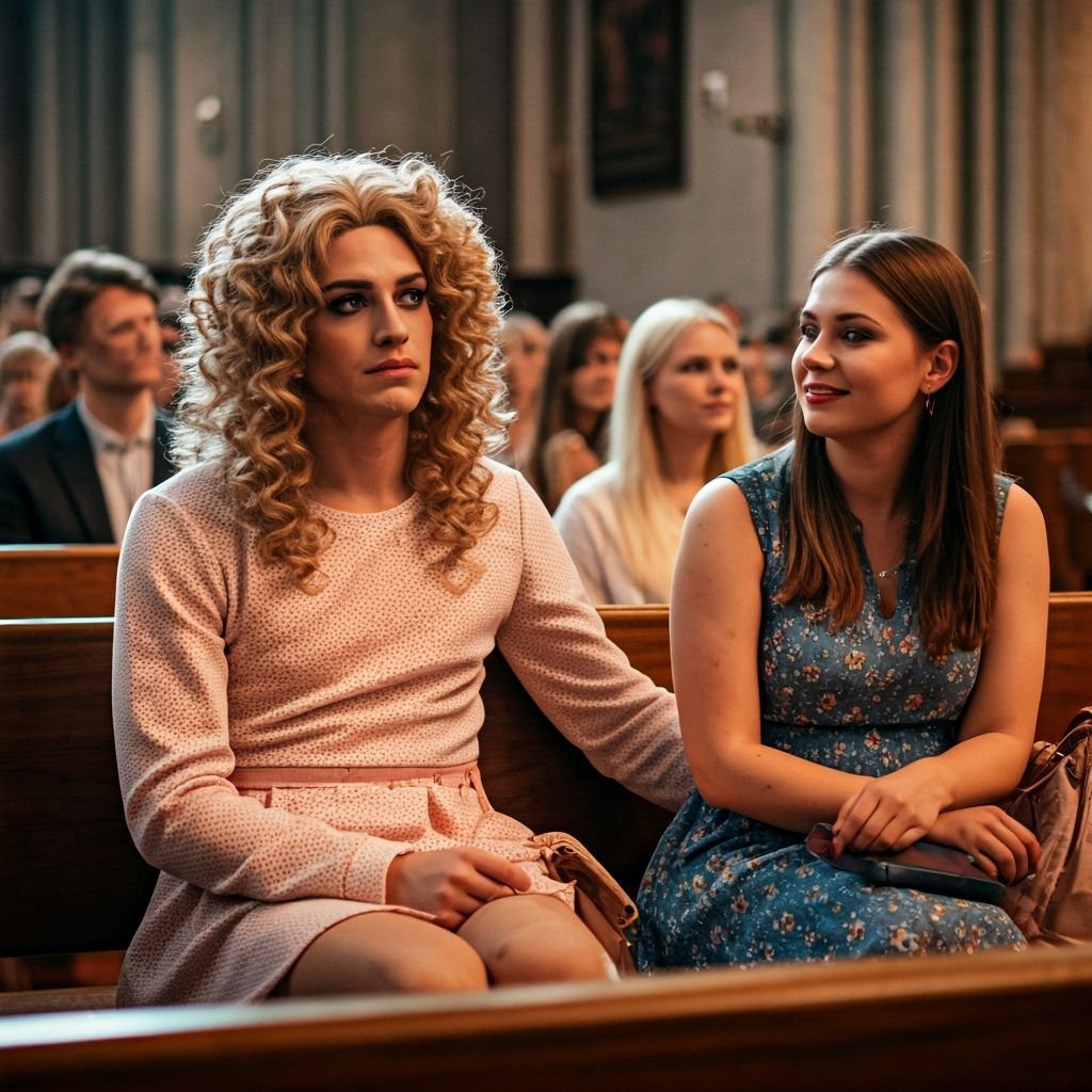 A cinematic still captures a worried androgynous individual with blonde hair, dressed in a babydoll dress, sitting beside a smiling woman on a church bench. The scene features film grain and dramatic lighting.