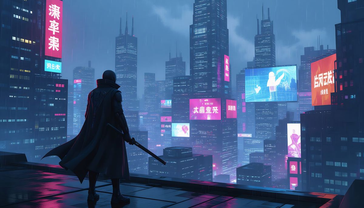 A lone cyborg ninja surveys a sprawling cyberpunk city from a rooftop. Rain reflects neon lights on skyscrapers, emphasizing the ninja's cybernetic enhancements in this cinematic digital artwork.