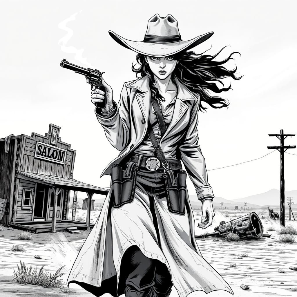 A striking black-and-white illustration of a lone cowgirl walking through a deserted ghost town, her intense gaze and worn gear evoking a sense of rugged determination.