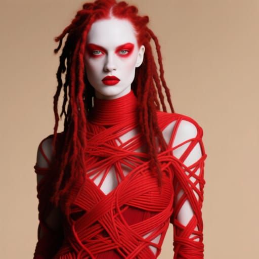 This image shows a woman with white skin and striking red dreadlocks, wearing a structured red outfit. The portrait features intense makeup and direct gaze, with a photorealistic, high-fashion aesthetic inspired by digital art.
