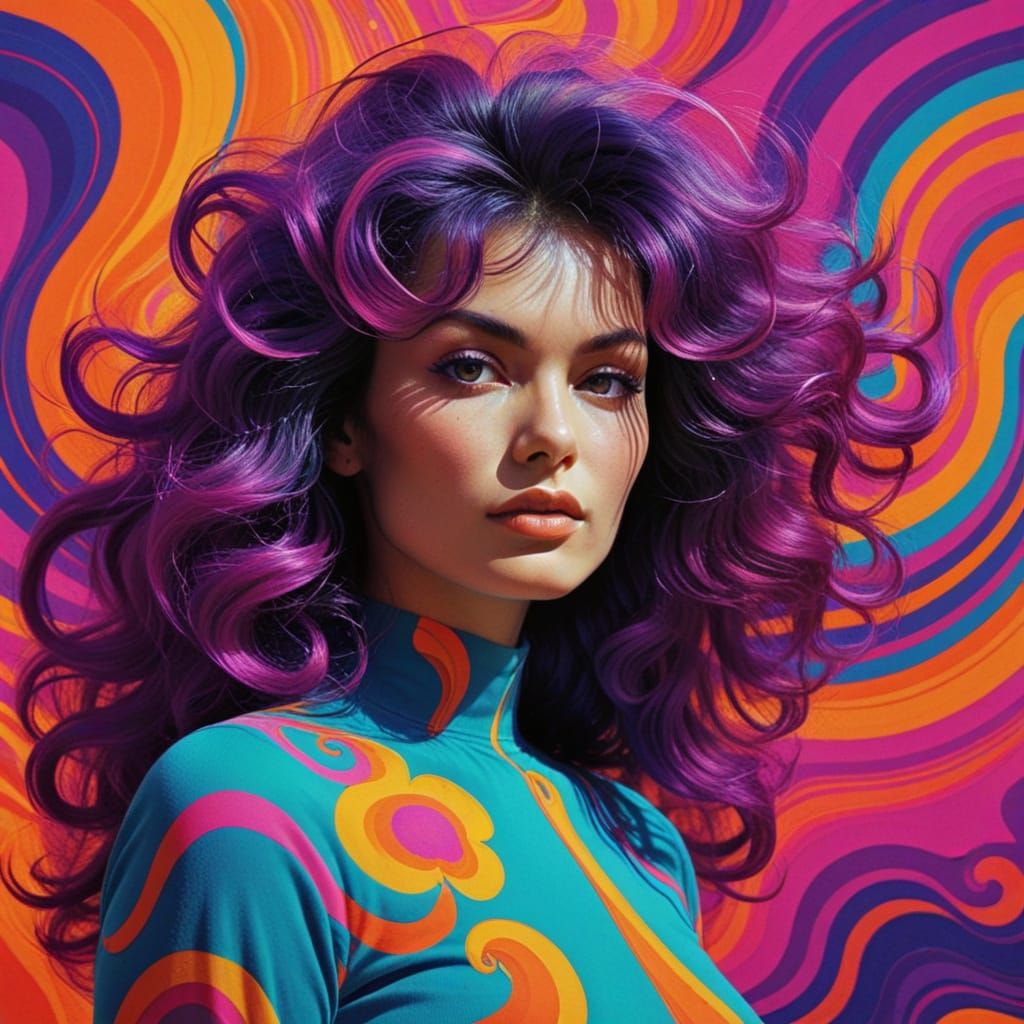 Psychedelic poster art. Medium shot. A woman with fluffy hair stands against a swirling background. Vibrant neon colors flow with organic lines and curves. Art by Victor Moscoso. Trippy optical illusions emanate from her form. Bold, flowing linework. Groovy, amplified patterns. Electric tangerine and ...
