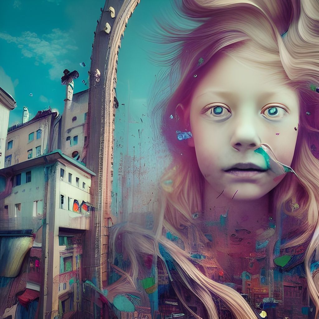 A vibrant image of a girl in a dreamlike state, set against an urban backdrop. The artwork showcases intricate textures and graffiti elements, reflecting urban culture in a vaporwave aesthetic.