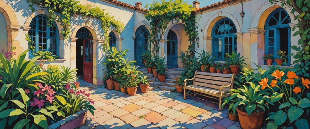 This image showcases a cheerful, sunlit garden scene with stone arches, benches, and abundant tropical plants and flowers. Rendered in a bright, watercolor-comic style with dramatic light.