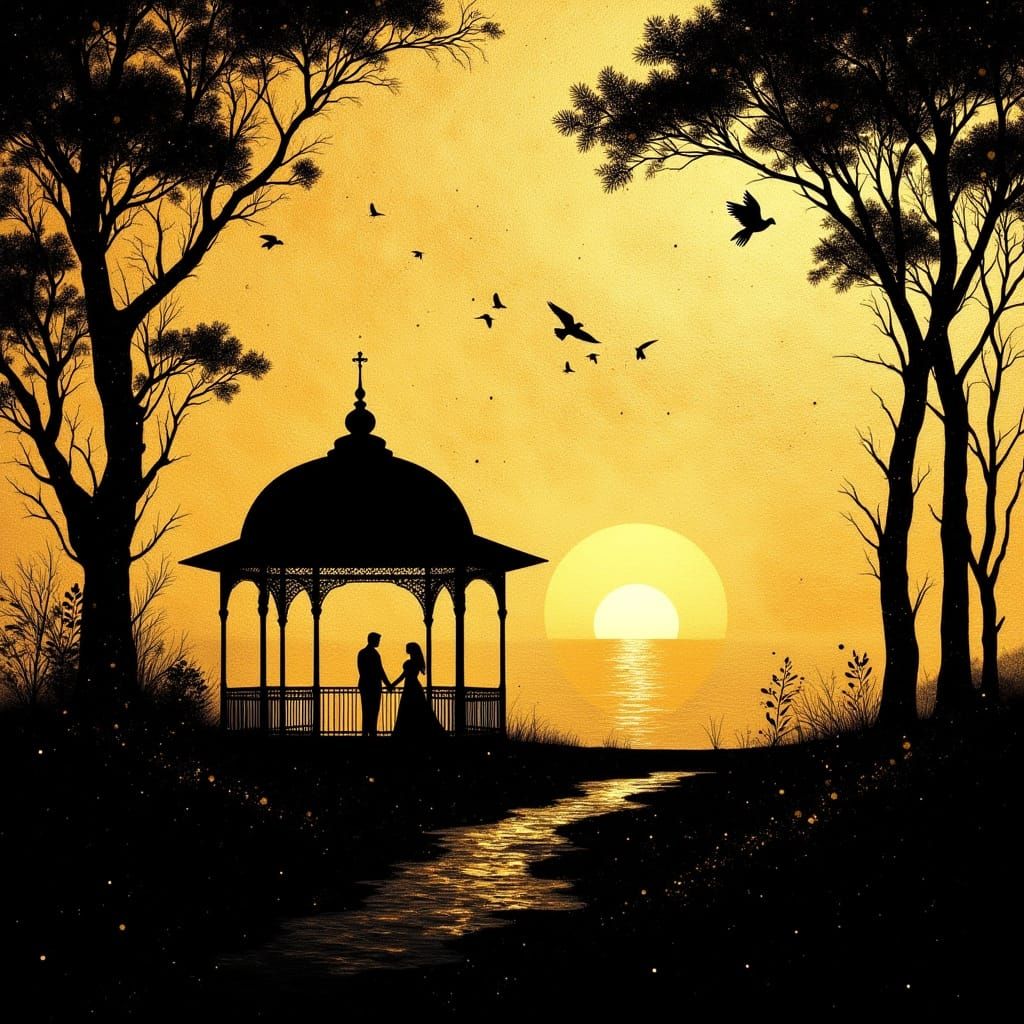 This image showcases a gazebo at sunrise, featuring a romantic couple inside. The artwork blends Art Nouveau elegance with a striking gold and black duotone aesthetic.