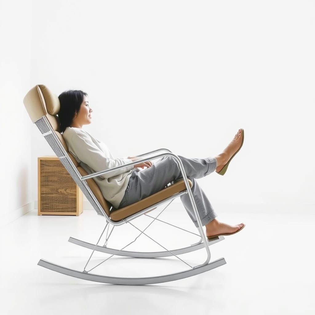 This image shows an aluminum rocking chair with a cushioned seat in a minimalist white room. A person in casual clothes sits in the chair, which is rendered with clean lines and an industrial design aesthetic.