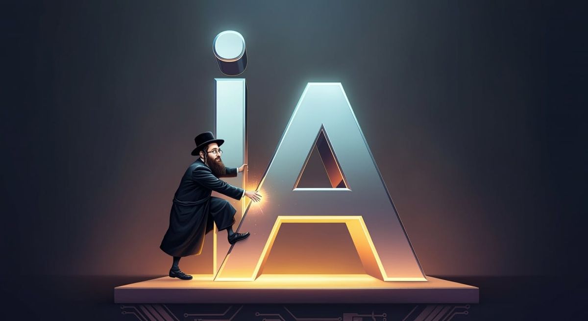 This image shows a young Hasidic scholar interacting with giant metallic letters in a playful manner. The digital illustration is rendered in a realistic comic style with clean lines, subtle shading and vibrant energy.