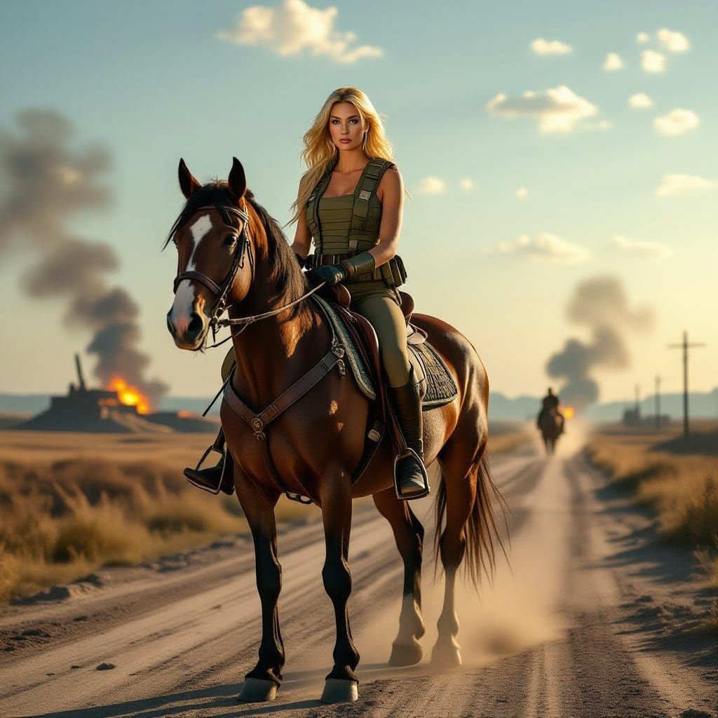 This hyperrealistic image depicts a determined woman in military attire riding a powerful warhorse on a desolate, war-torn road. Dramatic golden hour lighting enhances the gritty, cinematic atmosphere.