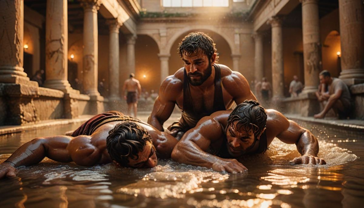 This image shows two wrestlers relaxing and receiving back massages in an Ancient Roman bath setting. Warm mist rises around them, illuminated by golden hour lighting in photorealistic style.