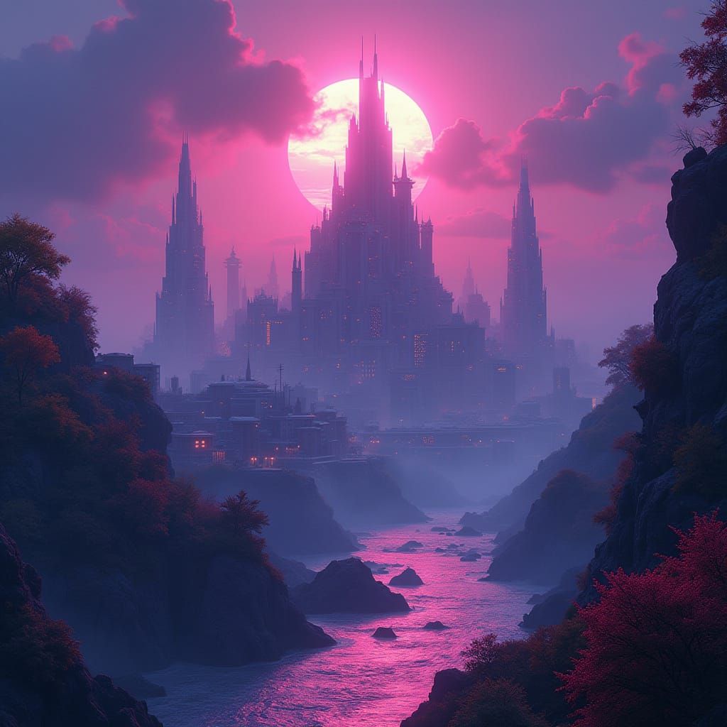 A detailed matte painting of a neon-drenched cityscape in electric phonk style, featuring rich colors and intricate textures against a vibrant gradient sky. Evokes fantastical energy.