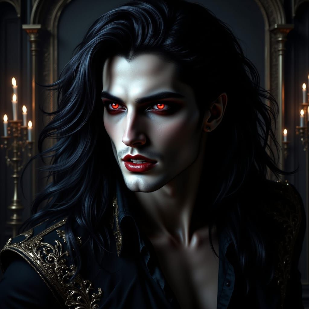 A hyperrealistic, detailed close-up portrait of a handsome vampire noble with long black hair and glowing red eyes, set in a dimly lit, ornate manor. Captured with cinematic realism.