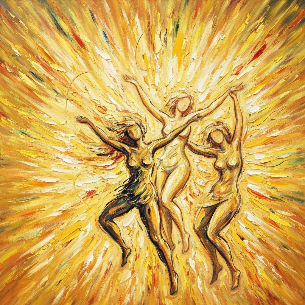 This image shows an oil painting filled with pure joy and elation. Abstract figures dance and celebrate amidst swirling brushstrokes in warm, radiant colors, evoking a sense of light and movement.