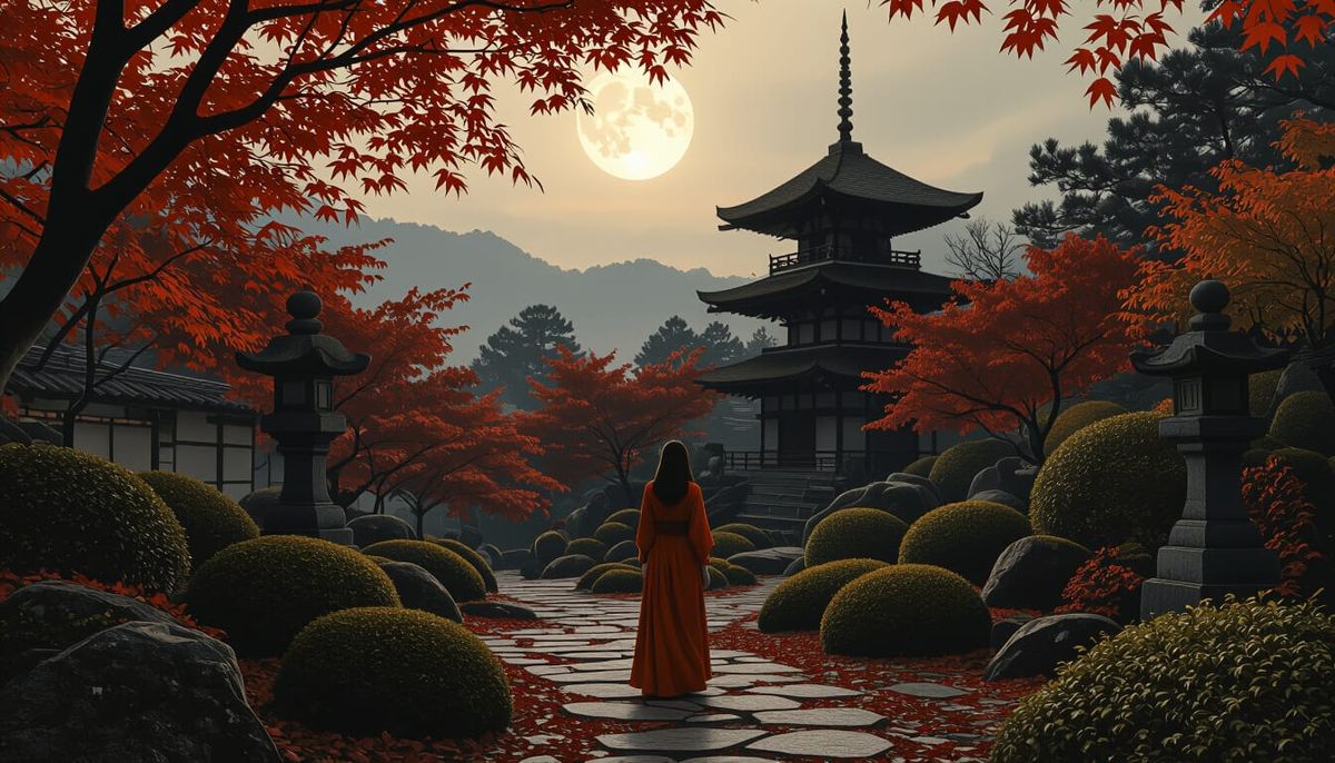 This image depicts a serene Kyoto autumn garden bathed in soft moonlight, featuring a woman in an orange dress amidst brown leaves. The art style blends dark fantasy and hyperrealism with atmospheric lighting.