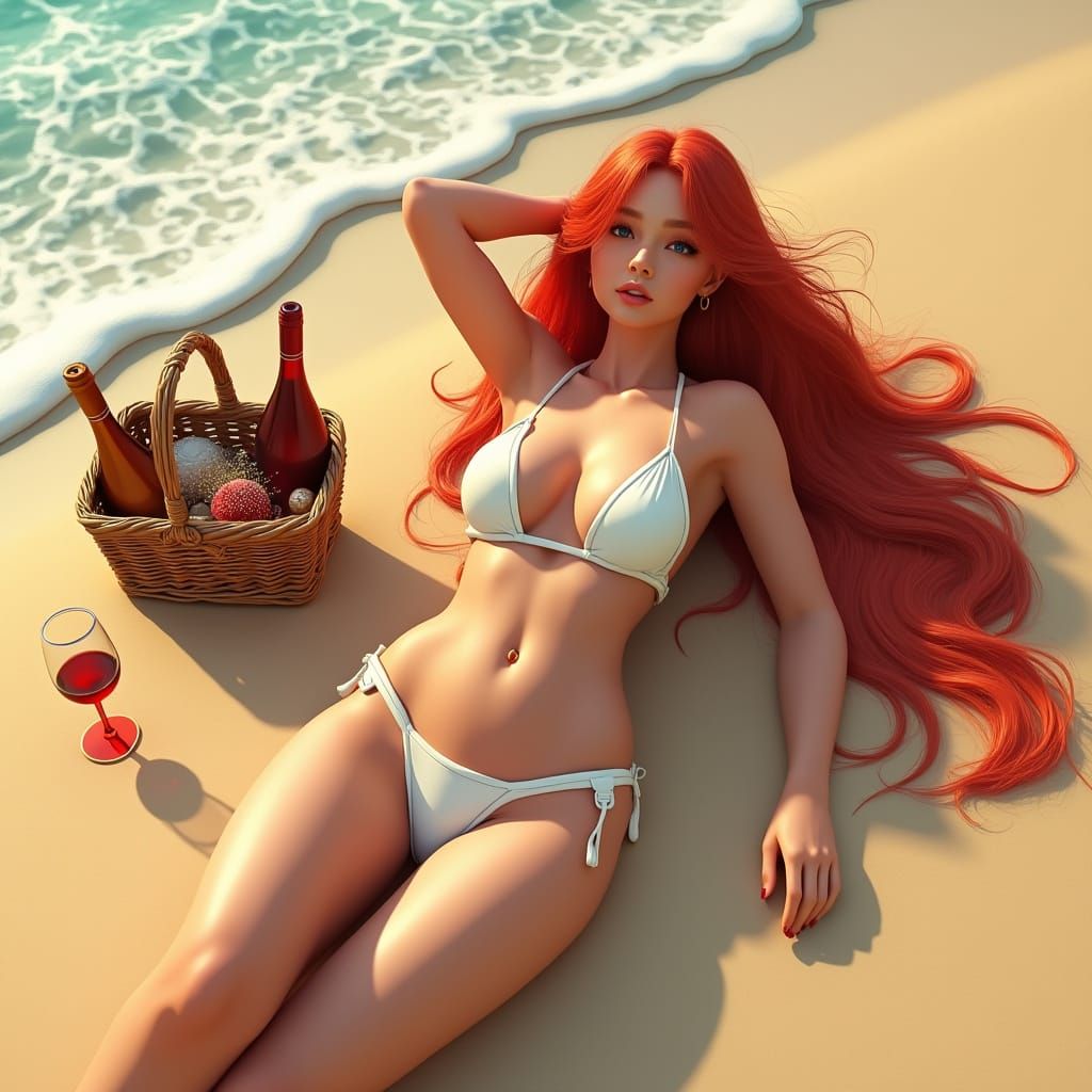 This image shows a beautiful redhead in a white bikini relaxing on a golden sand beach. The 3D digital art style features glamorous and sensual vibrant colors, intricate textures and subtle lighting.