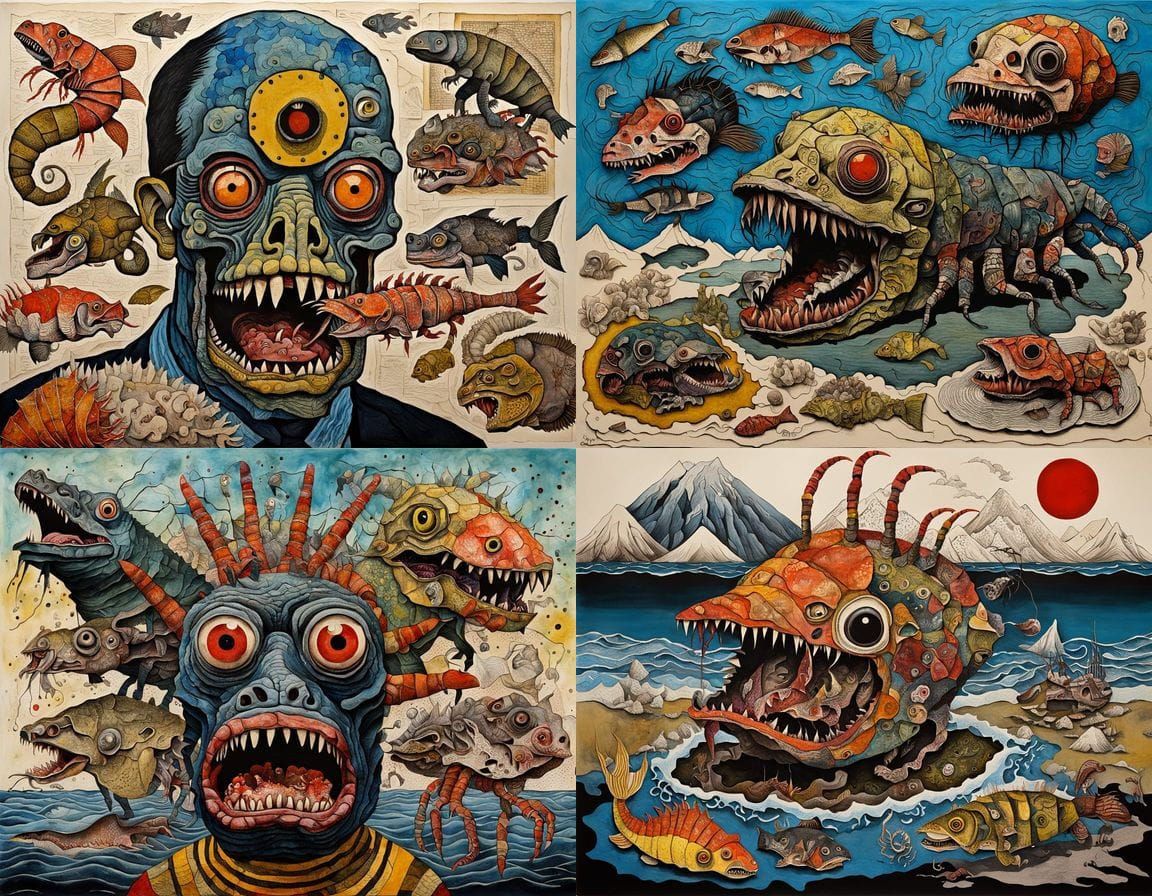 This image shows a nightmarish, 3D depiction of a grotesque lobster mutant amidst a decaying Japanese environment, blending traditional and modern media in a disturbing, surreal scene.
