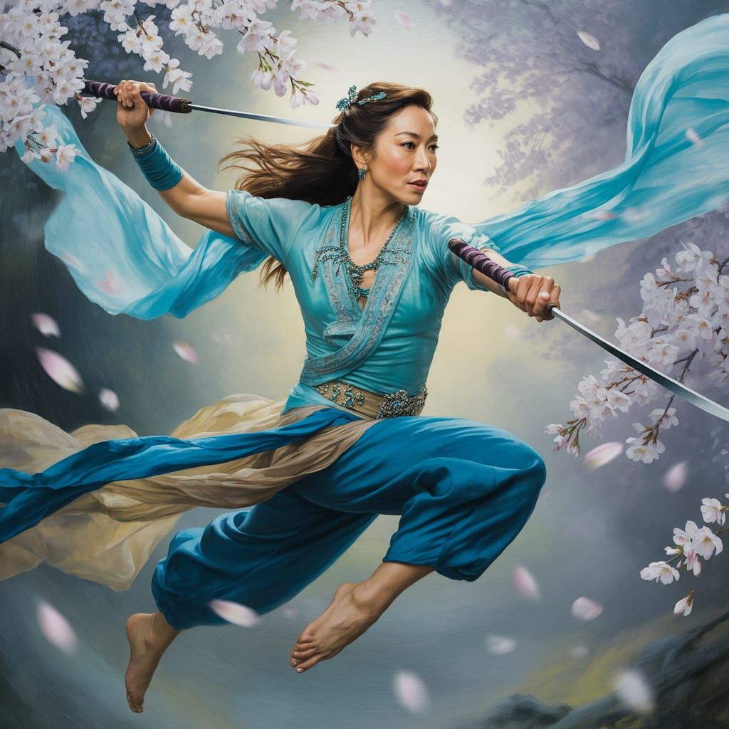 A beautiful image of a martial arts master gracefully leaping through falling cherry blossoms. She wears turquoise jewelry and flowing silks, wielding dual swords with intense focus in a dreamlike dance of shadows and light.