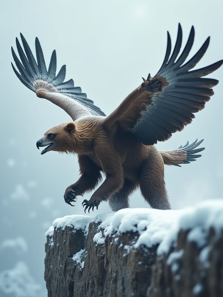 This hyperrealistic image shows a majestic, scientifically-plausible predator hybrid, Griffursus raptorialis, in mid-air, with its massive wings outstretched and fur seamlessly transitioning into feathers, set against a cinematic, snowy landscape.