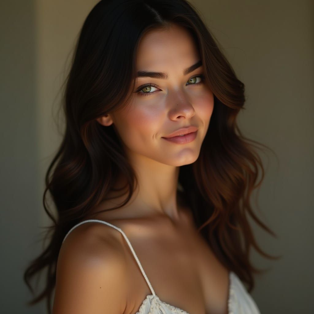This image showcases a stunning, ultra-realistic portrait of a woman in her early 30s, with long, dark brown hair and a serene, thoughtful expression. Her elegant features and subtle curves evoke a sense of modern sophistication and quiet strength.