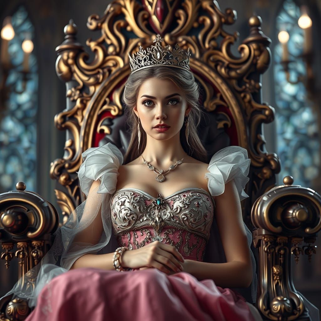 This hyperrealistic image shows a smug princess seated regally on a jewel-encrusted throne. The cinematic composition features dramatic lighting and high contrast for a moody, atmospheric feel.