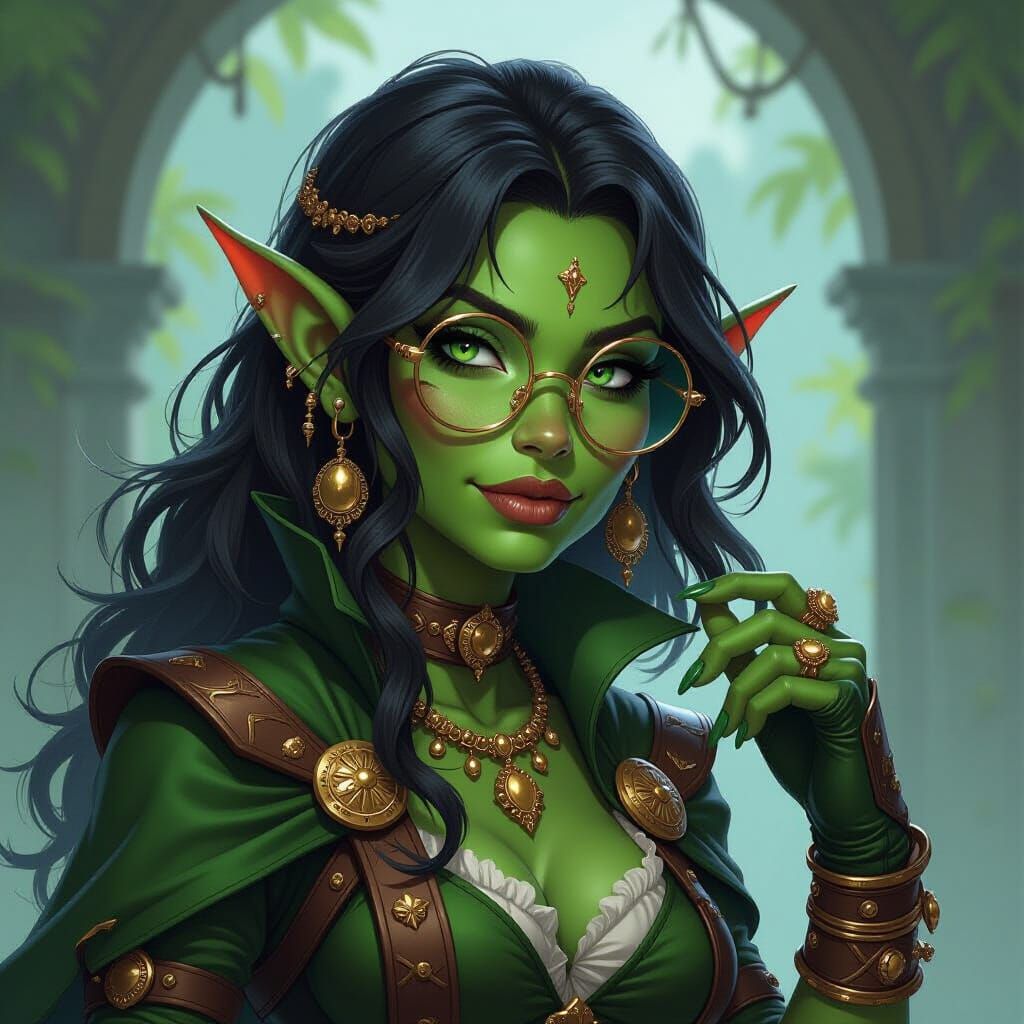 This image features a green-skinned female goblin rogue with dark hair, detailed jewelry, and round gold glasses. Concept art style with dramatic lighting and vivid emerald and gold tones.
