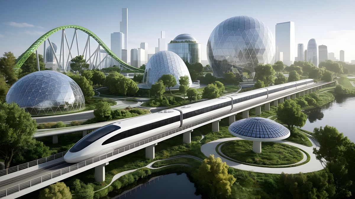 This serene image depicts a futuristic eco-city, blending sleek transportation systems with lush greenery and unique architecture, creating a clean and optimistic atmosphere.