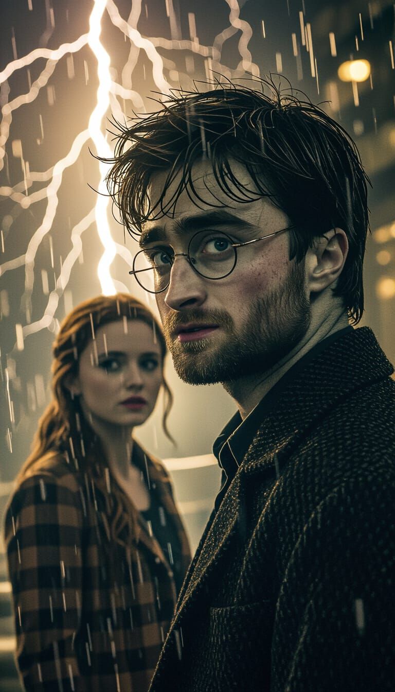 A dramatic scene of a man and woman in a solarpunk thunderstorm, reminiscent of Tim Burton and vorticism. The image is cinematic, with film grain and dye-transfer aesthetics.