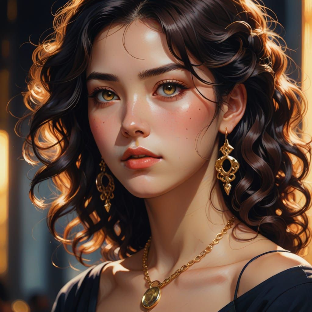 A striking picture of a woman with dark curly hair, golden jewelry, and piercing eyes. This digital painting captures a hyper-realistic anime portrait with warm, dramatic lighting.