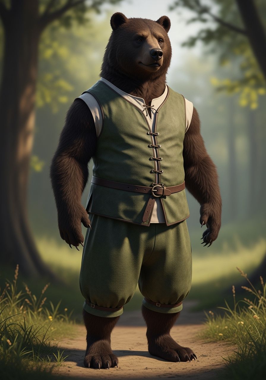 This image shows a dark brown, humanoid bear standing upright in a medieval forest clearing. He wears green trousers and a vest, with detailed fur and clothing textures highlighted by soft lighting.