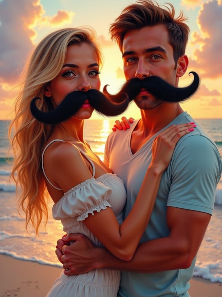 This image shows a romantic couple embracing each other warmly, set against a breathtaking 8K beach background at sunset, with vibrant, expressive brushstrokes and meticulous textures reminiscent of James Gurney and Simon Stalenhag's styles.