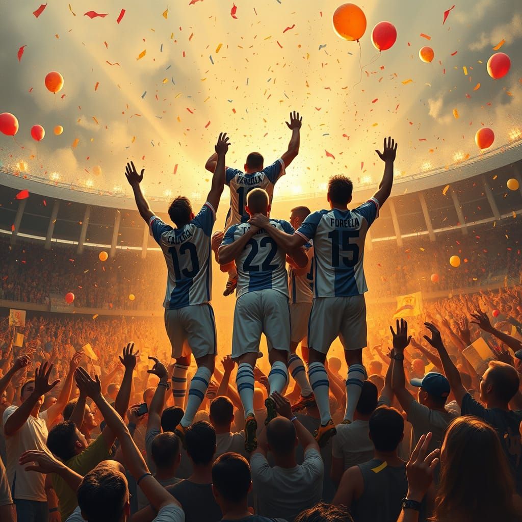 This image captures the triumphant moment when Real Zaragoza players ascend to the top of the stadium, surrounded by cheering fans, confetti, and balloons, in a dynamic and expressive style that blends Mexican Muralism and Spanish Romanticism, evoking the energy of Rivera, Orozco, and Goya