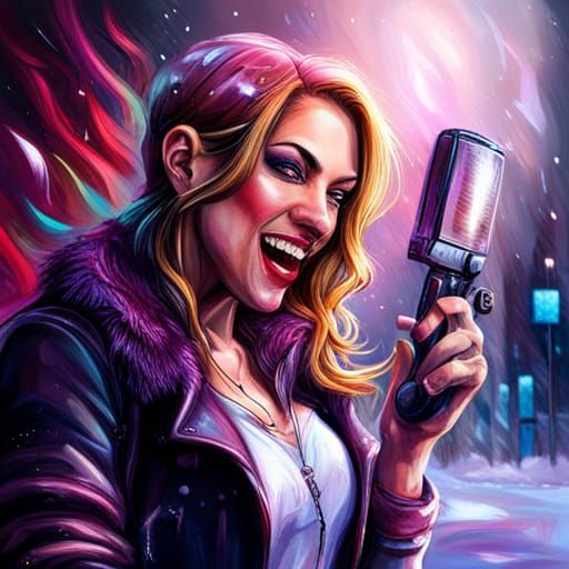 This image shows a laughing woman in a fur coat, depicted in a graffiti art style. The piece features high contrast, colorful elements, and ultra-detailed textures, reminiscent of street art.